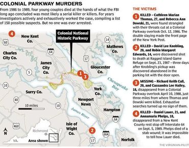 Virginia waterman Alan Wade Wilmer, Sr. has now been confirmed as a serial killer in the Colonial Parkway Murders. He is the confirmed by both VSP and FBI as the killer of Robin Edwards and David Knobling at Ragged Island in 1987, as well as the murder of Teresa "Teri" Howell in Hampton, VA in 1989. Alan Wade Wilmer Sr. Wilmer has also been linked to the disappearance and likely murder of Keith Call and Cassandra Hailey in 1988 in the Colonial Parkway Murders.